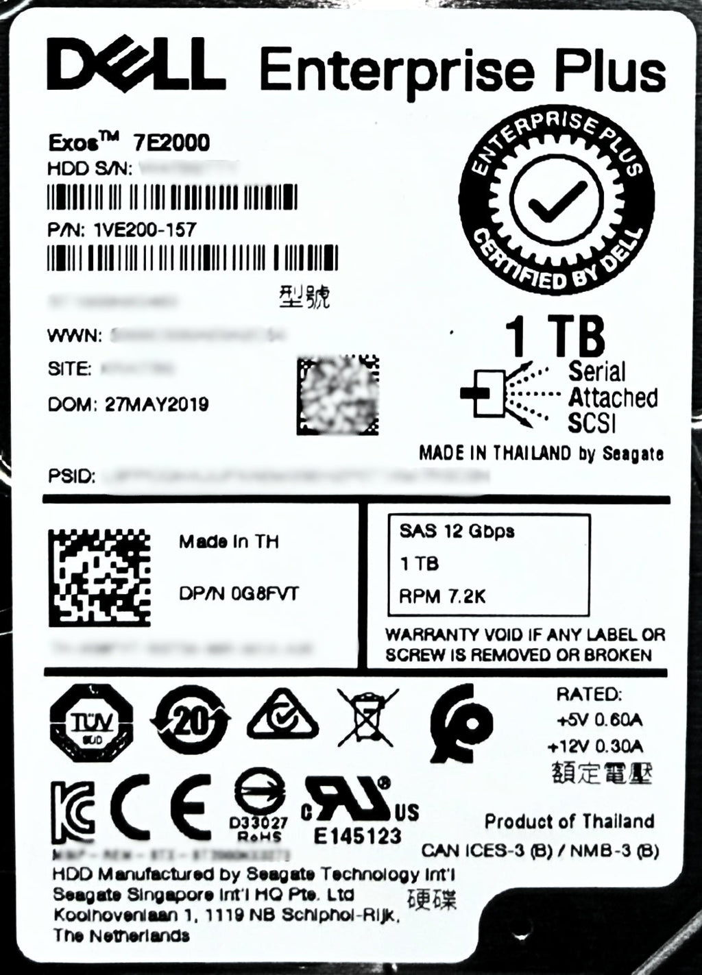 Disco duro Dell G8FVT de 1 TB, 7,2 K, SAS de 2,5 pulgadas y 12 GB E+