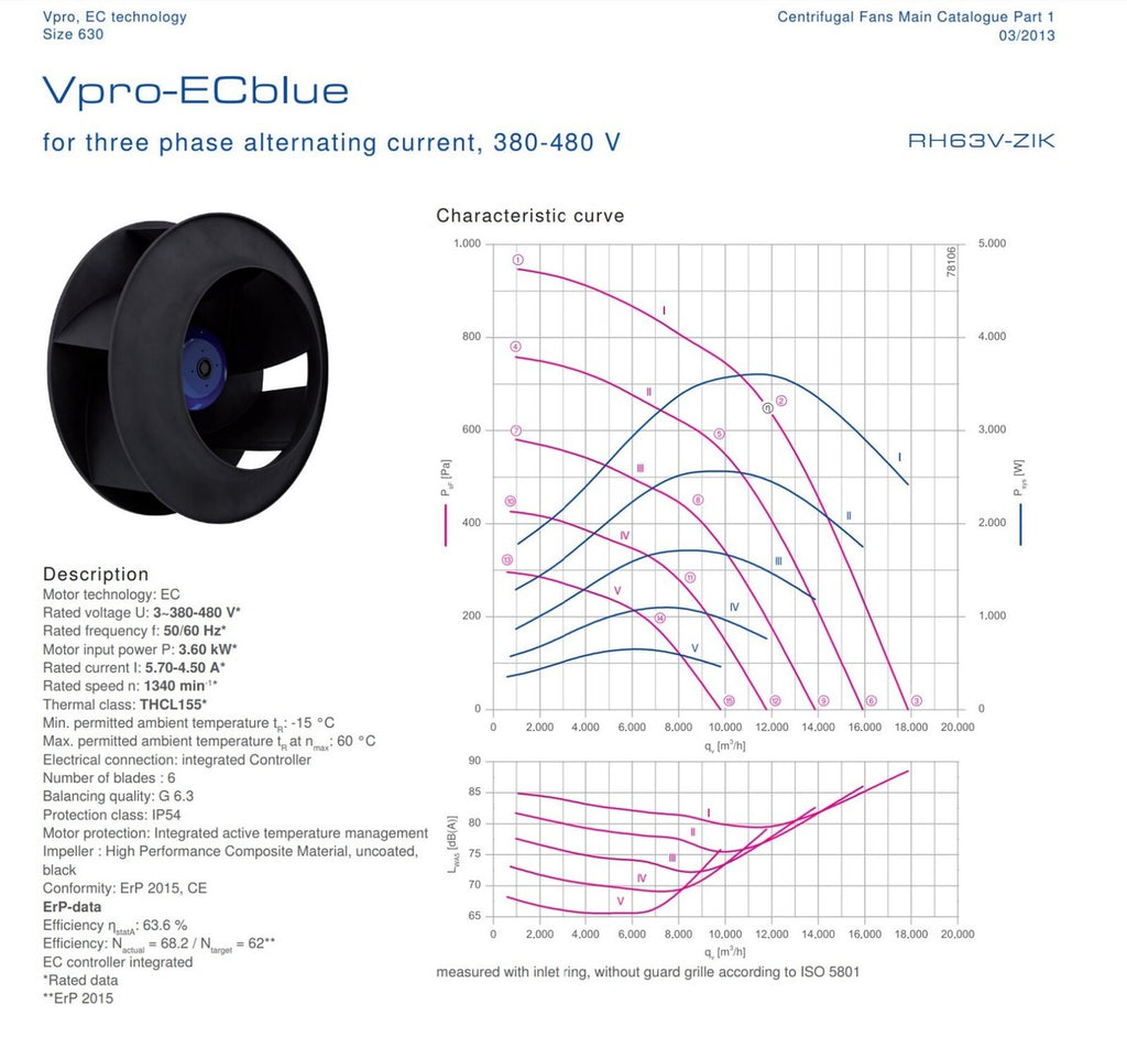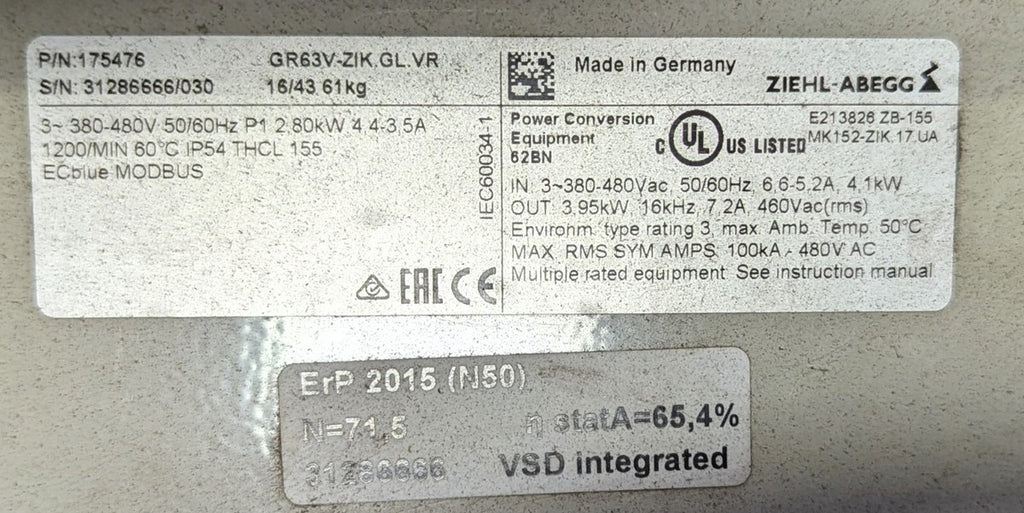 Ziehl - Abegg EC Blue Centrifugal Fan 175476 GR63V-ZIK.GL.VR 380-480v 3 ph.